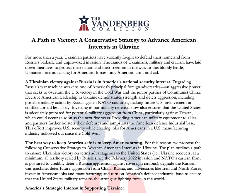 October 4, 2023 —The Vandenberg Coalition, a network of conservative national security professionals that promotes a strong and proud American foreign policy, released a public letter signed by over 100 leading conservatives urging Congressional Republicans to increase support for Ukraine.